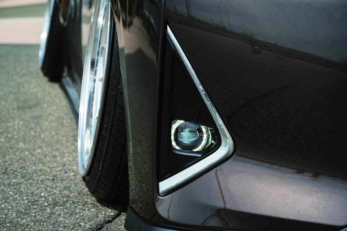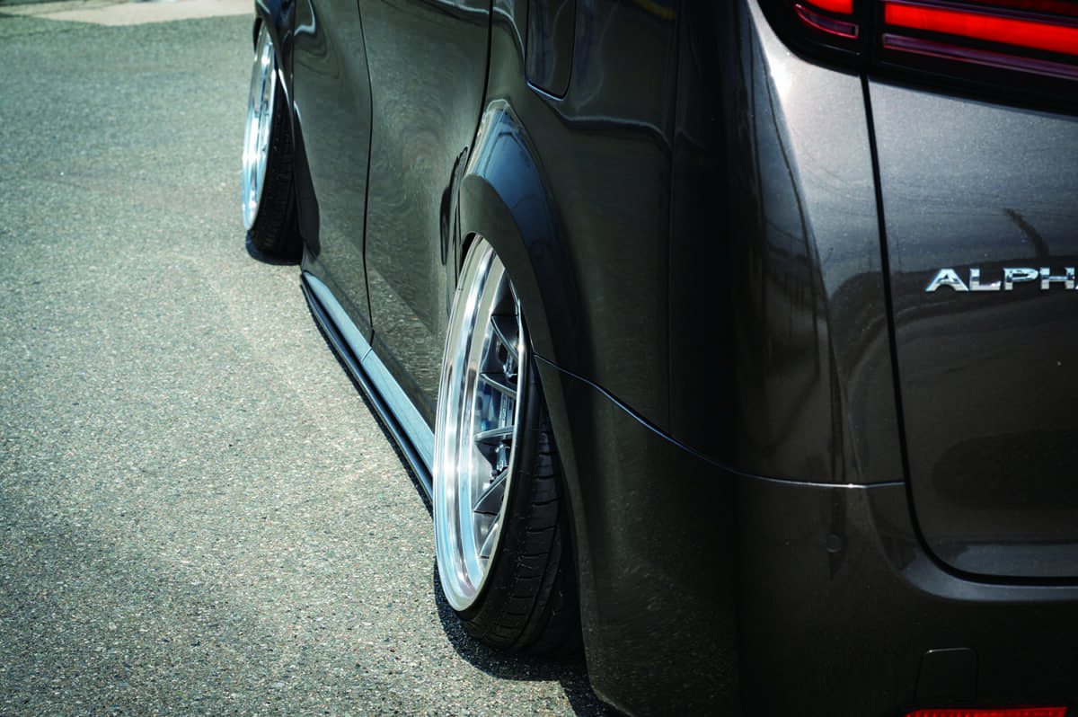 足まわりはエアサスを採用する。ベタ落ちフォルムのインパクトをより引き立てているのは、大分県の「リバイブ」が製作したワンオフのオーバーフェンダーだ。フロント15mm、リア25mmと出幅の数値は控えめながら、アーチの厚みをノーマルと同等とするなど技アリの工夫により、30系アルファードおよびヴェルファイアの特徴であるボディサイドの「うねり」にダイナミックな迫力をプラスしている。数値以上の存在感を演出しているのがポイントだ。