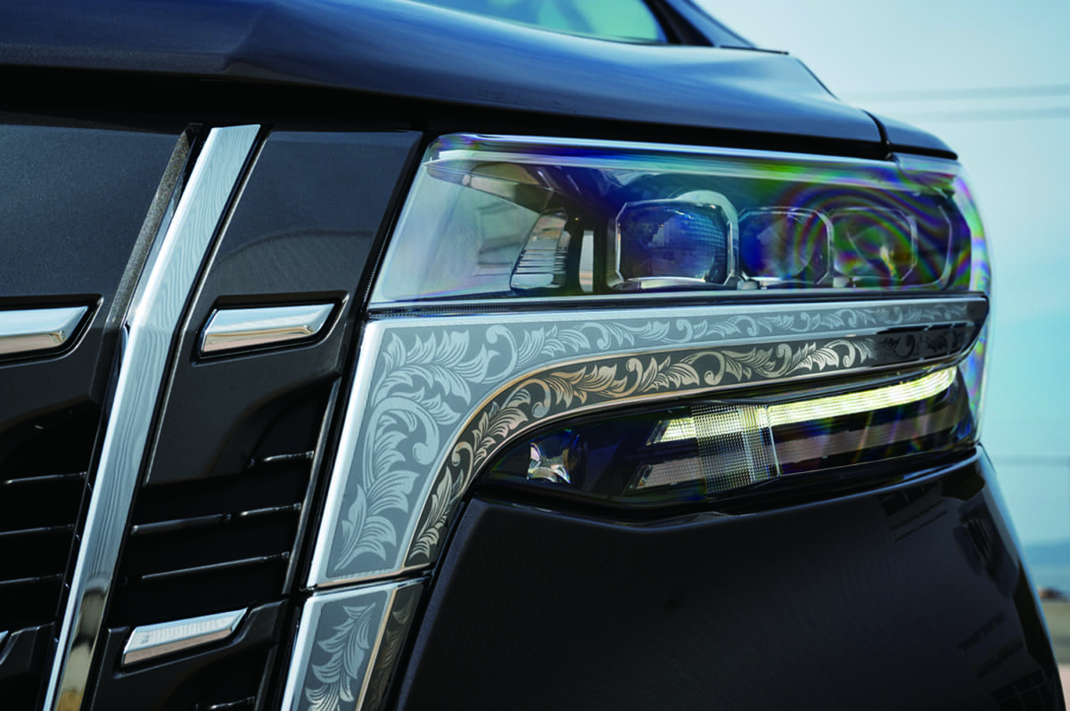 • トヨタ アルファード:エングレービング柄のフィルムはTSKグラフィック製。市販のセット品ではカバーされていない部分についてはワンオフでオーダーしている