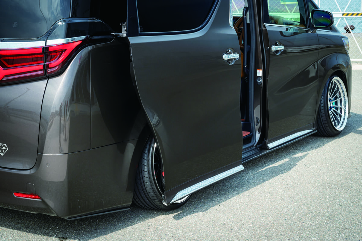 • トヨタ アルファード:リアフェンダーは25mmのワイド化が行われているが、スライドドアはしっかり開閉可能。フロントドアにはノア/VOXY用のイージークローザーを移植。ちなみにサイドのエアロは326power製