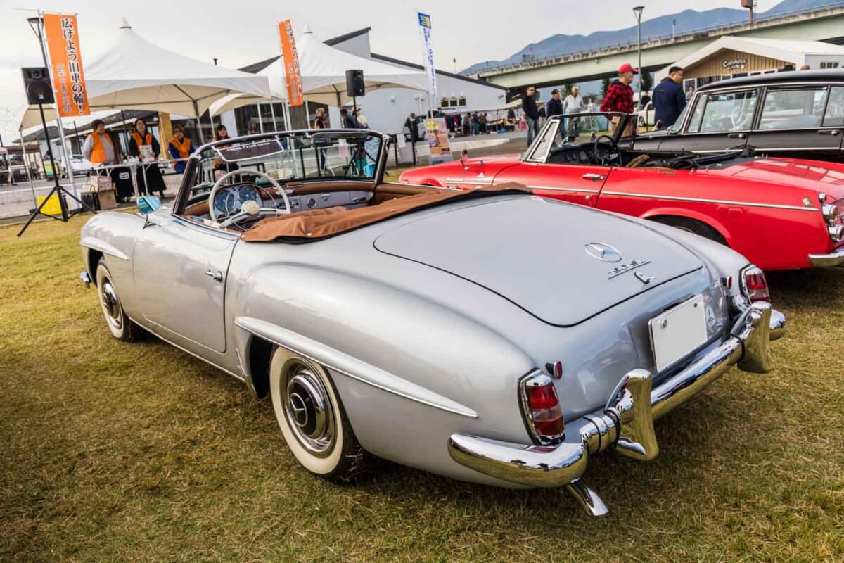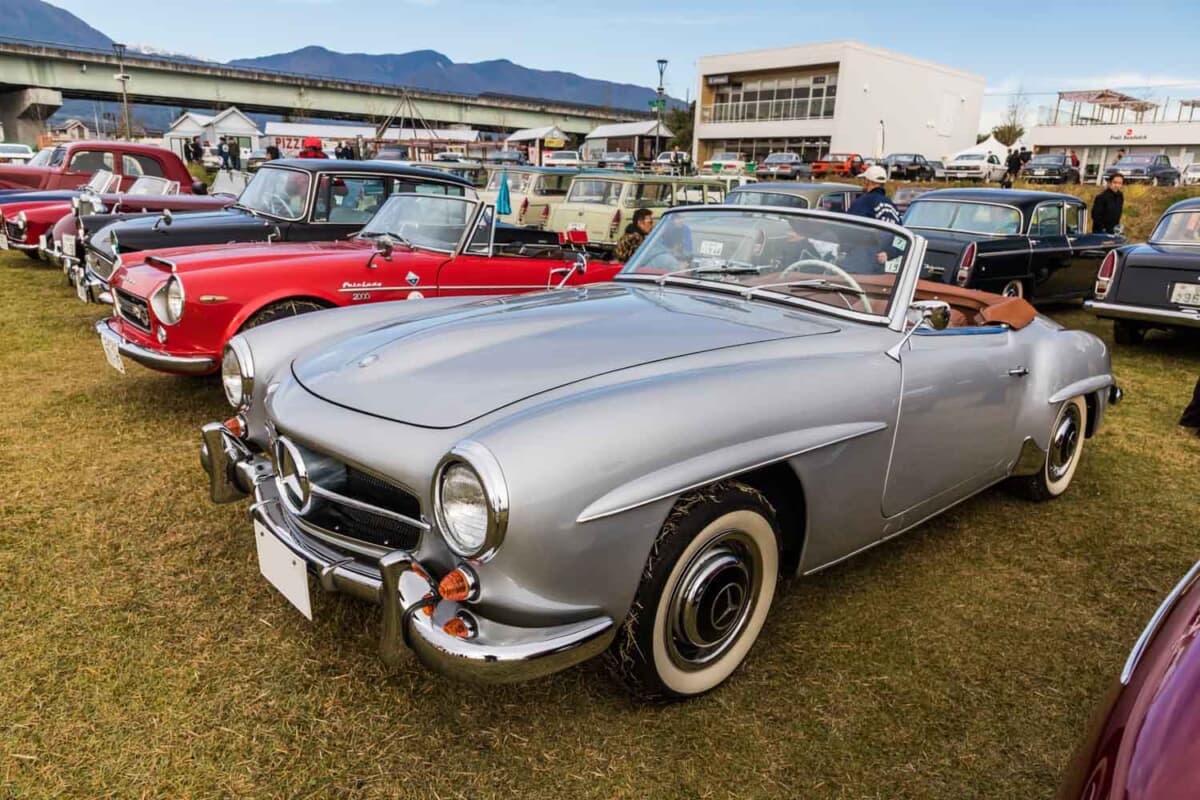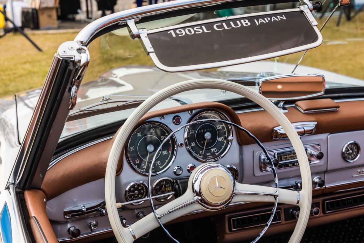 南アルプス市のフモット南アルプス内にある芝生広場で「クラシックカーミーティング in 山梨南アルプス」が開催され、会場には100台を超える旧車が集結しました。今回はそんな会場のなかから、流麗なボディを持つオープン2シーター、メルセデスベンツ「190SL」を紹介します。プロ顔負けのDIYで内装を仕上げ、15年間乗り続けているオーナーの愛情がたっぷり詰まった1台をレポートします。