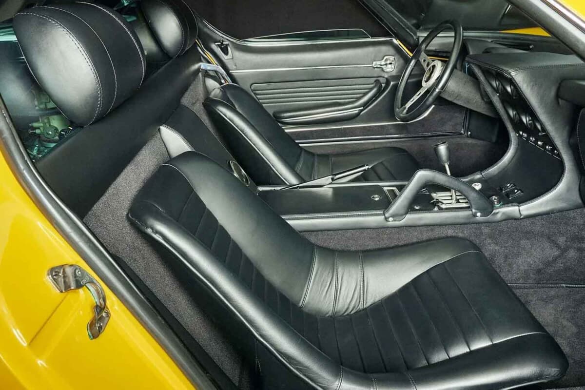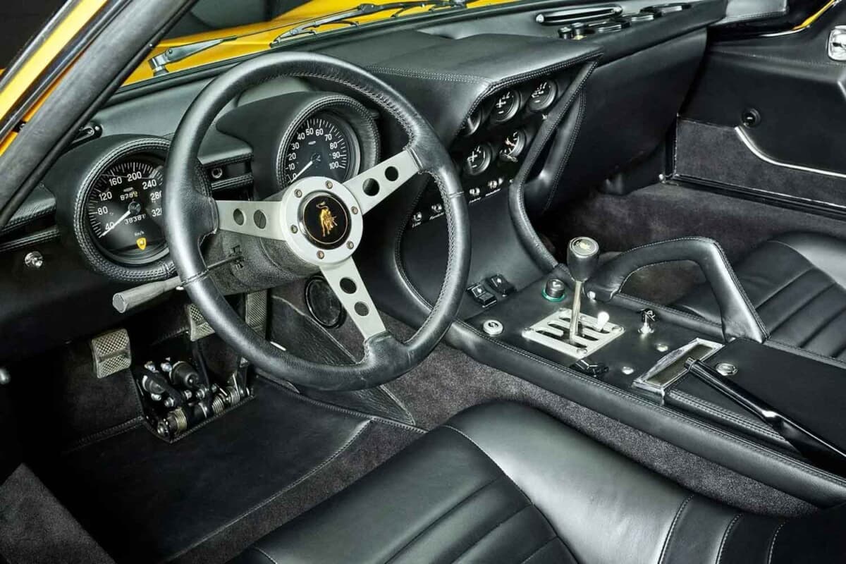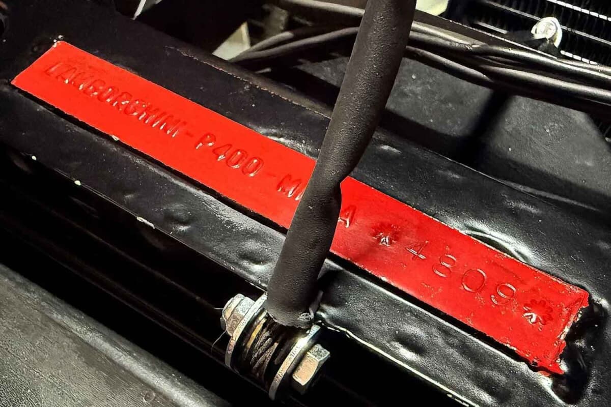 今回の出品車であるP400ミウラSは1971年型だから、338台が生産された同モデルのなかではもっとも遅い時期にデリバリーされた1台だ。ブレーキにはグレードアップ版の新たなベンチレーテッドディスクとパッドを採用したものが組み合わされ、ランボルギーニによってシャシーナンバーとのマッチングが確認されているV型12気筒エンジンも、のちにP400ミウラSVで採用される「エンジンとミッションのオイル潤滑をセパレートしたシステム」へとアップグレードされている。