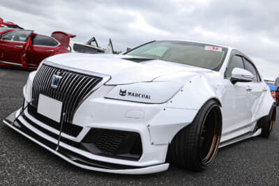 トヨタ「クラウンセダン」を着地寸前にしたら…21インチホイールを呑み込みシンプルなカッコよさが実現! 今後カスタムのベース車として人気が出る!?