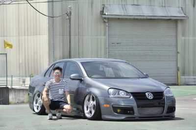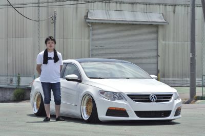 豊満でボリューム満点なフェンダーライン。唯一無二のワンオフエアロや19インチとしては限界の車高が刺激的。パンチのある存在感を黄金カラーのホイールが上手い具合にまとめている。全方位、隙のない作り込みで攻めた一台。